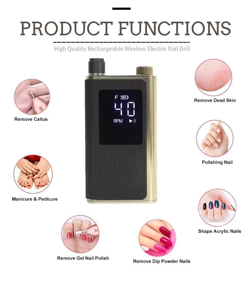 この 40,000 rpm 高速プロフェッショナルネイルドリルのディスプレイデザインには、オン/オフスイッチと正逆回転があり、合計 1 つのボタンで起動できます。下部に急速充電ソケット、上部に交換可能なドリルソケットがあり、さまざまなニーズを満たすために 3 段階で速度を調整できます。