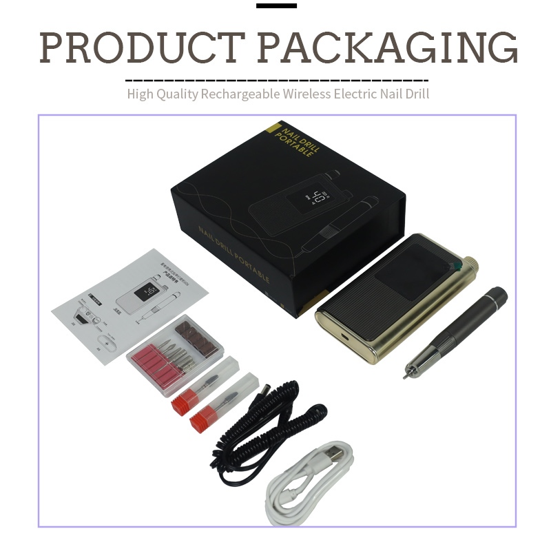 この40,000 rpmの高速プロフェッショナルネイルドリルパッケージの内容には、サンディングペン製品、USB充電ケーブル、製品取扱説明書、軽量で持ち運び可能なボックスが含まれています。
