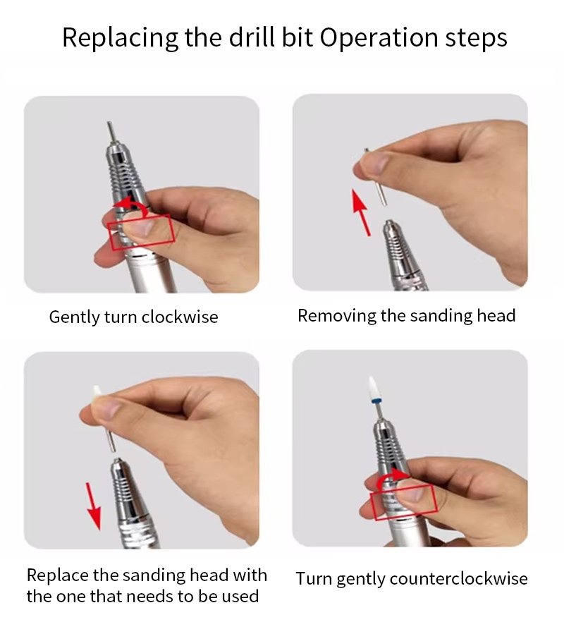 この手持ち式ネイルドリルとポリッシャーの交換用ドリルの操作方法は、プラグアンドプルで、簡単で便利で、完成後に交換できます。