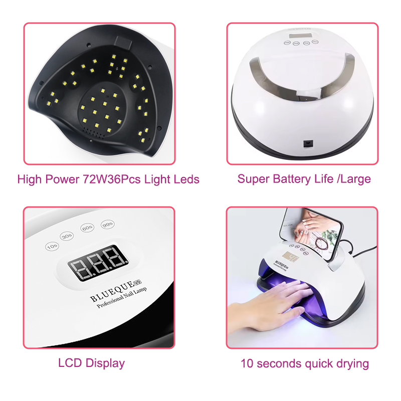 タイマー機能を備えた高品質のネイルランプにより、接着剤が収縮することなく均一に乾燥します。デュアル光源は穏やかな加熱を提供し、手の変色や目の疲れを防ぎ、手と足の両方に適しており、驚くほど速い乾燥結果をもたらします。