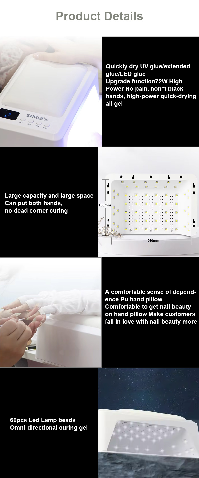 この製品は、接着剤を収縮させることなく均一に乾燥させます。デュアル光源は穏やかな加熱を提供し、手の変色や目の疲れを防ぎ、手と足の両方に適しており、驚くほど速い乾燥結果をもたらします。