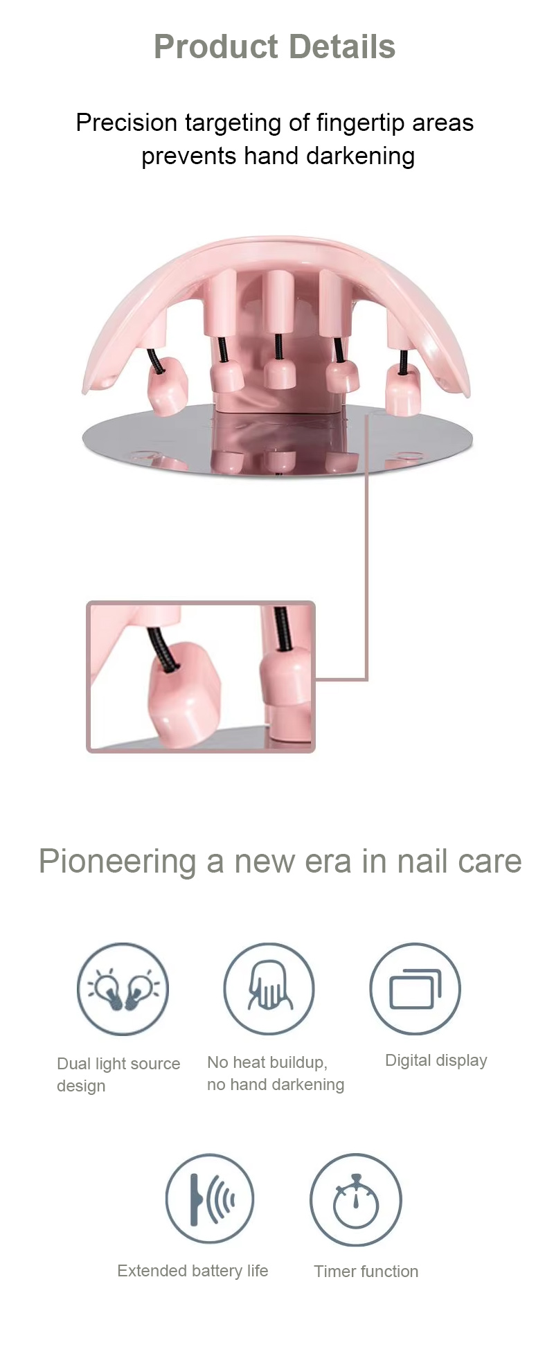この製品は、接着剤を収縮させることなく均一に乾燥させます。デュアル光源は穏やかな加熱を提供し、手の変色や目の疲れを防ぎ、手と足の両方に適しており、驚くほど速い乾燥結果をもたらします。