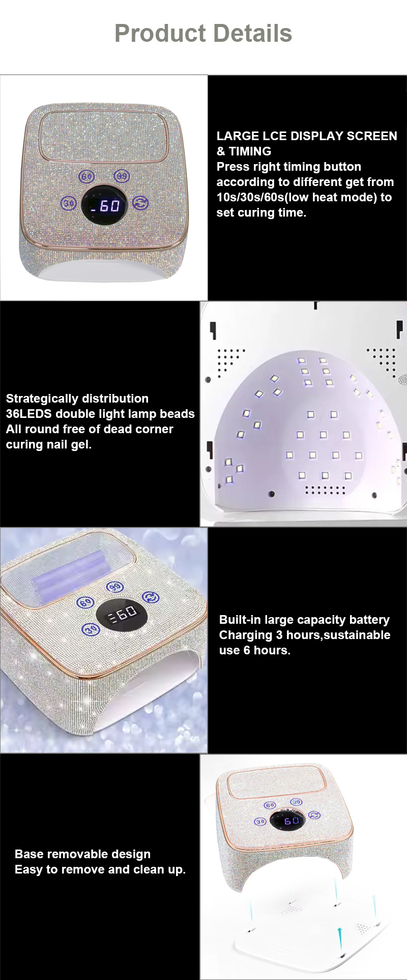 この製品は、接着剤を収縮させることなく均一に乾燥させます。デュアル光源は穏やかな加熱を提供し、手の変色や目の疲れを防ぎ、手と足の両方に適しており、驚くほど速い乾燥結果をもたらします。