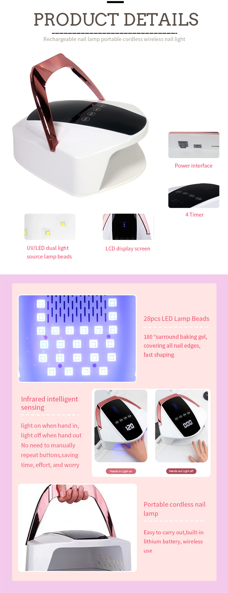 充電式マニキュアランププロフェッショナルバージョン90W製品の外観にはグルーブデザインがあり、溝へのハンドルはポータブルハンドルの役割として使用でき、持ち運びと配置がより便利になります。また、ハンドルが簡単に壊れて緩むことの不利な点を回避します。