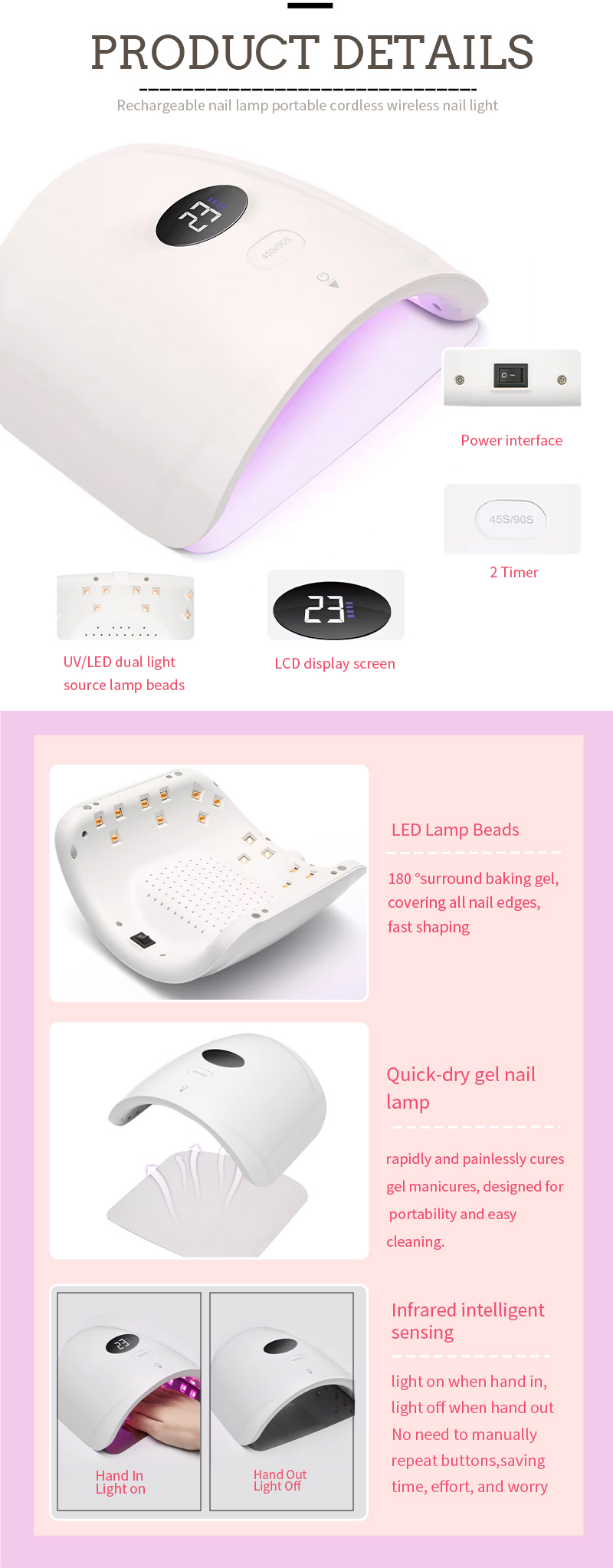 15600mAhShenzhen Ruina Optoelectronics Co., Ltd. は、家庭用 UV 接着ネイルランプの中国の大手メーカー、サプライヤー、輸出業者として、一貫して完璧な品質を追求するという理念を掲げています。このこだわりにより、当社の家庭用UV接着ネイルランプは多くのお客様から信頼を得ています。卓越したデザイン、プレミアム原材料、卓越したパフォーマンス、競争力の高い価格設定、これらはまさにすべての顧客が期待するものであり、当社が提供するものです。もちろん、充実したアフターサービスも同様に不可欠です。